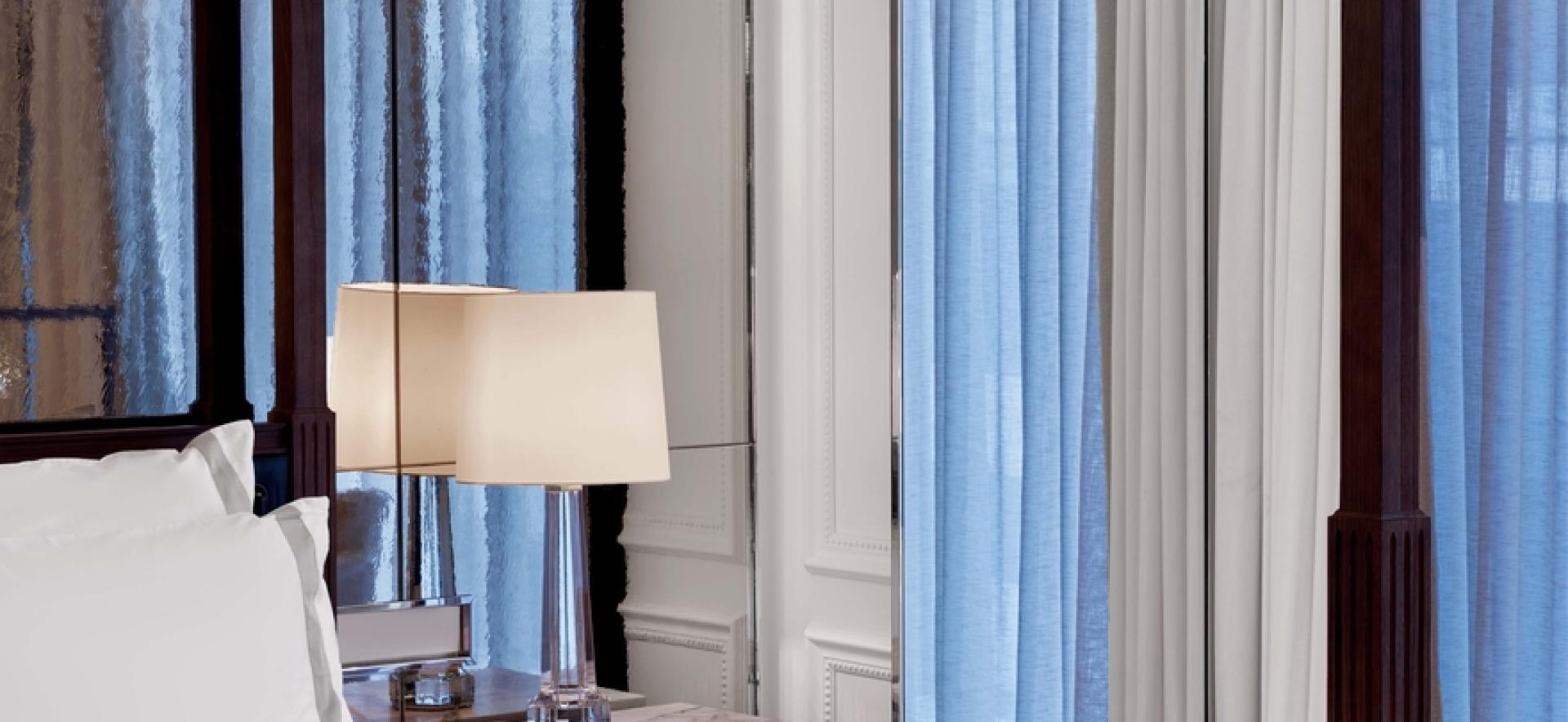 바카라 컬렉션에서 엄선한 오리지널 예술 작품들과 벽면을 환하게 비추는 크리스탈 스콘스.