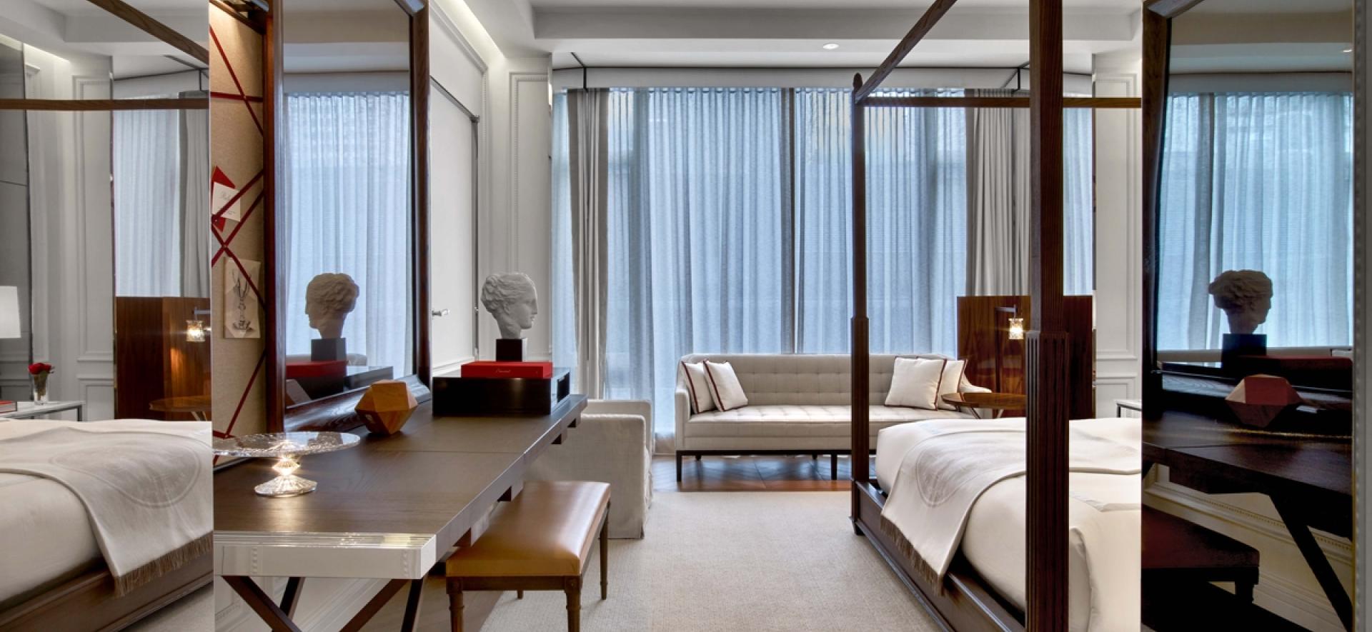 바카라 크리스탈 조명, 천장부터 바닥까지 이어지는 대형 창문, 고급스러운 4기둥 킹사이즈 침대, 그리고 맞춤 제작된 소파가 갖춰져 있습니다.