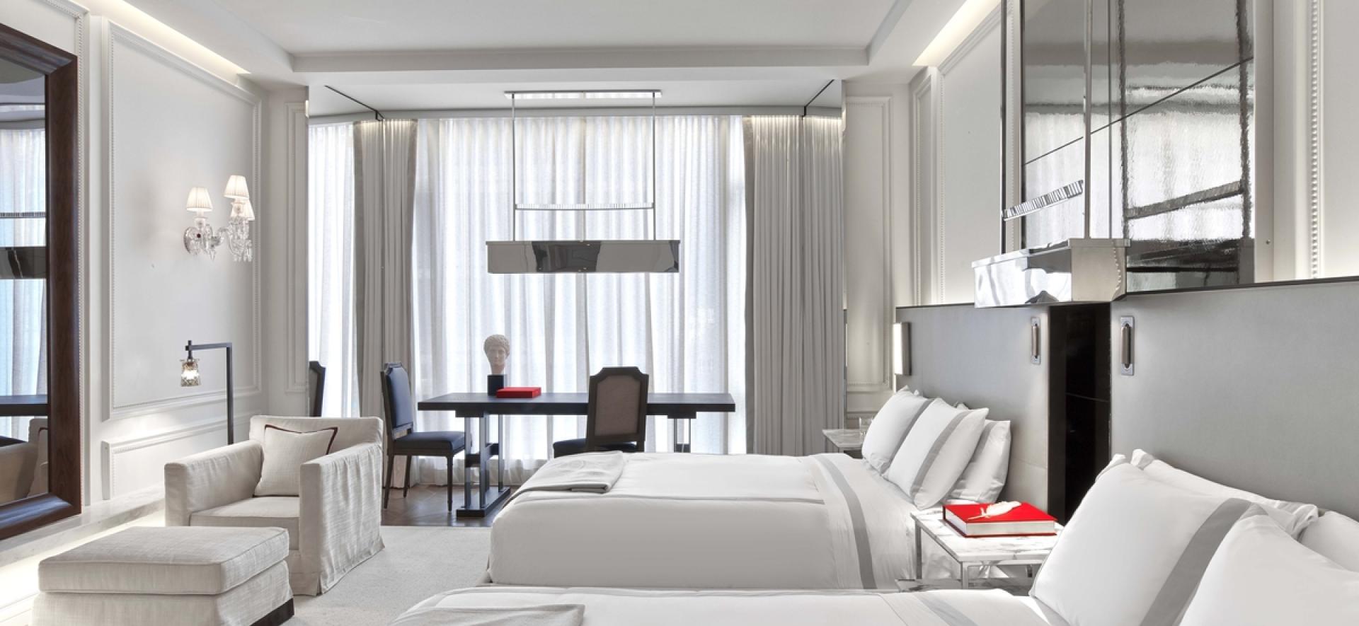바카라 크리스탈 조명, 천장부터 바닥까지 이어지는 창문, 고급스러운 더블 침대 2개, 그리고 별도의 휴게 공간을 갖추고 있습니다.