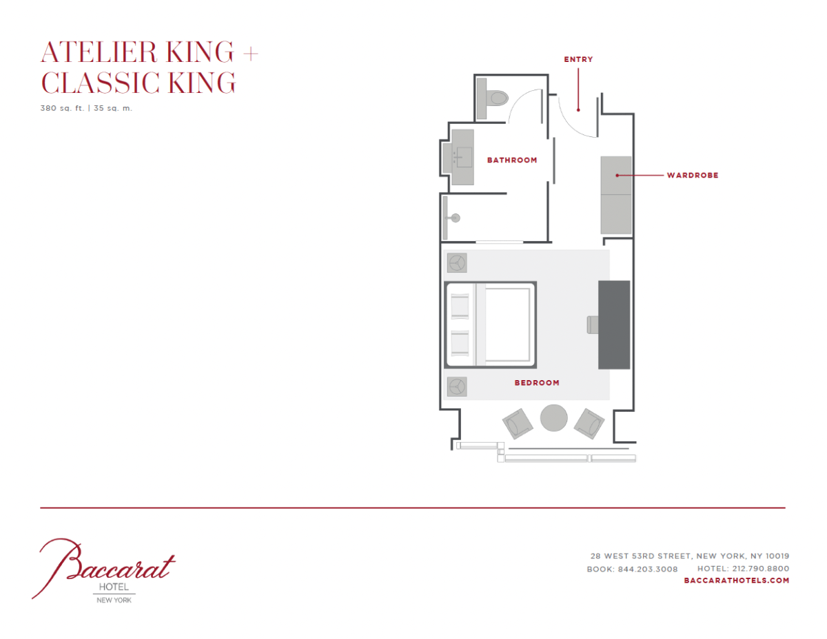 Situado entre o 8.º e o 12.º andar. Inclui luminárias em cristal Baccarat, janelas do chão ao teto, uma luxuosa cama king-size com dossel e uma área de estar separada.