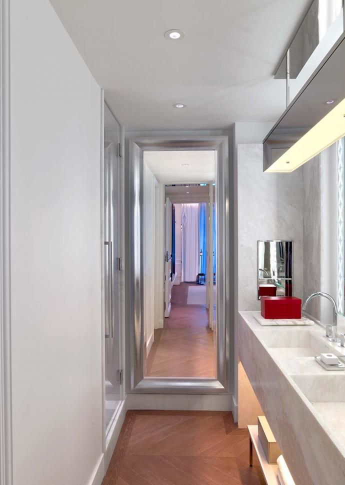 白色大理石台面、氛围感十足的灯光、柔软的意大利浴袍,以及巴黎Maison Francis Kurkdjian品牌的洗浴用品。